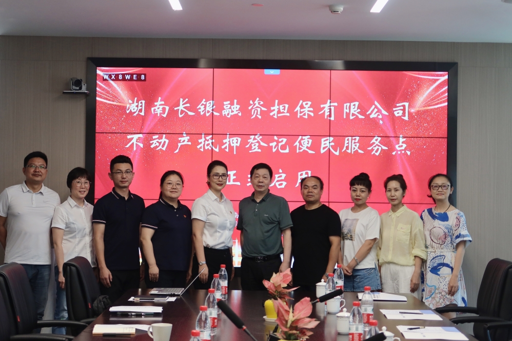 9月15日下午,长银担保公司不动产抵押登记便民服务点正式启用。启动仪式在长房国际大厦16楼会议室举行,长沙市不动产登记中心党委委员、副主任周国祥及相关业务负责人,担保公司董事长、总经理李彩彤、副总经理潘虹、周志高、陈帆共同参加,会议由担保公司副总经理周志高主持。